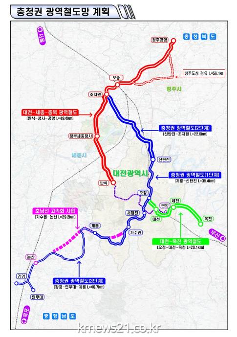 ‘충청권 광역철도 1단계 사업’은 현재 노반분야 기재부 총사업비 협의 중으로 총사업비 조정 후 국토부 실시계획인가를 거쳐 연내 착공할 계획이며, ‘대전~옥천 광역철도 사업’은 노반분야 등 기본 및 실시설계를 정상적으로 추진 중에 있다.