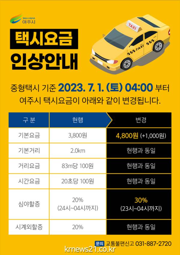 ▲ 여주시, 7월부터 택시요금 1000원 인상여주시는 오는 7월 1일 오전 4시부터 택시요금을 인상한다고 15일 밝혔다.