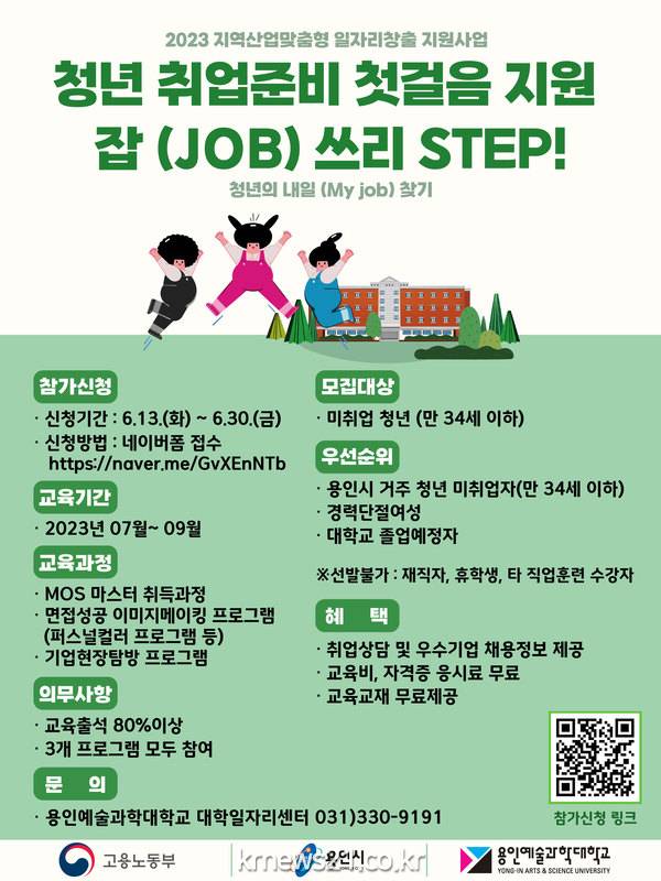▲ 사진=용인특례시가 30일까지 취업 준비 청년을 지원하는 ‘2023년 지역·산업맞춤형 일자리창출 지원사업(Job 3 Step)에 참여할 미취업 청년 30명을 모집한다.용인특례시(시장 이상일)가 30일까지 취업 준비 청년을 지원하는 ‘2023년 지역‧산업맞춤형 일자리창출 지원사업(Job 3 Step)에 참여할 미취업 청년 30명을 모집한다고 16일 밝혔다.