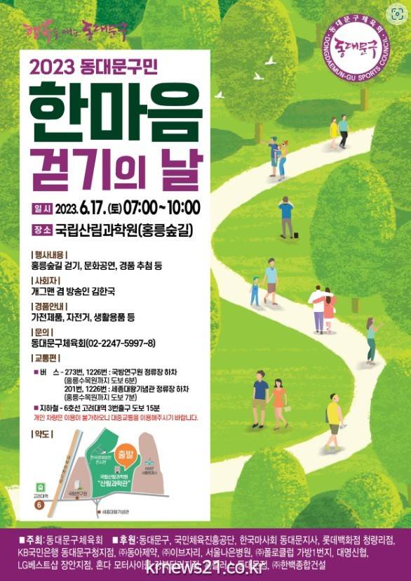 ▲ 사진=‘2023 동대문구민 한마음 걷기의 날’ 행사 포스터동대문구(구청장 이필형)가 구민의 건강 증진과 화합을 위해 오는 17일 오전 7시 국립산림과학원 홍릉숲에서 가족과 함께하는 ‘구민 한마음 걷기의 날’ 행사를 개최한다.