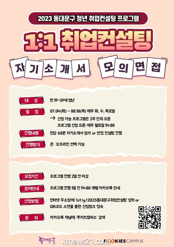 컨설팅은 만 19세부터 39세 청년을 대상으로 7월 4일부터 8월 10일까지 진행되며, 신청은 프로그램 진행 2일전까지 가능하다. 참여를 원하는 경우 인터넷주소창에 ‘bit.ly/2023동대문구취업컨설팅’을 입력하거나 QR코드로 스캔하여 신청링크에 접속해 신청하면 된다.