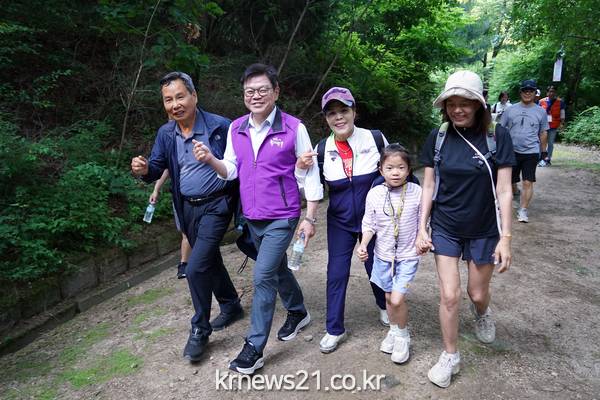 ▲ 사진=이필형 동대문구청장(왼쪽 두 번째)이 구민과 함께 홍릉숲 산책로를 걷고 있다.동대문구(구청장 이필형)가 17일 오전 7시 동대문구체육회 주최로 ‘2023 동대문구민 한마음 걷기의 날’ 행사를 개최했다고 밝혔다.