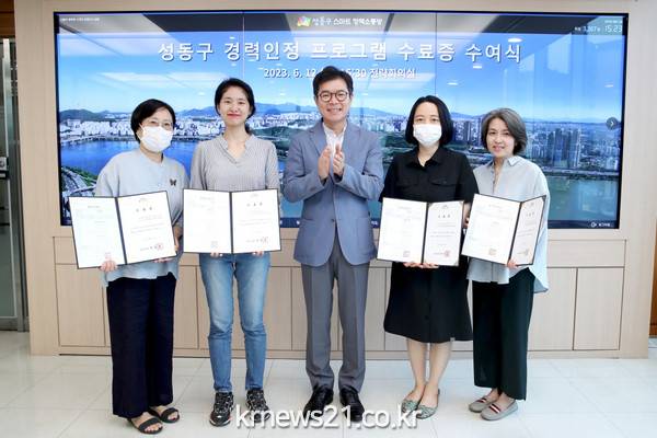 ▲ 사진=성동구는 지난 12일 올해 경력인정 프로그램 과정을 마친 1호 수강생들에게 경력인정서를 수여하는 수료식을 개최했다. (사진 가운데 정원오 성동구청장)서울 성동구(구청장 정원오)가 지난 12일 올해 경력인정 프로그램 과정을 마친 1호 수강생 6명에게 수료증과 경력인정서를 수여하는 수료식을 개최했다.