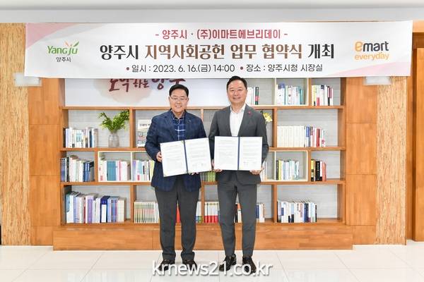 ▲ 양주시, ㈜이마트에브리데이와 지역사회공헌 업무협약 체결양주시(시장 강수현)는 지난 16일 시청 시장실에서 ㈜이마트에브리데이(대표이사 김성영)와 함께 지역사회공헌 업무협약(MOU)을 체결했다.