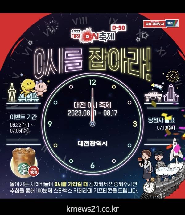 ▲ 대전 0시 축제, D-50일 맞이‘0시를 잡아라’SNS이벤트대전시가 오는 8월 개최되는 ‘대전 0시 축제’ D-50일을 맞아, 축제에 대한 관심도 제고와 홍보를 위해 6월 22일부터 7월 5일까지 SNS 이벤트를 진행한다고 밝혔다.