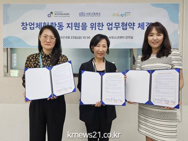 □ 부천여성청소년재단(대표이사 양선희)이 운영하는 부천미래교육센터는 6월 23일 시온고등학교, 크리앙트레와 청소년 창업체험활동을 지원하기 위하여 업무협약을 체결하였다.