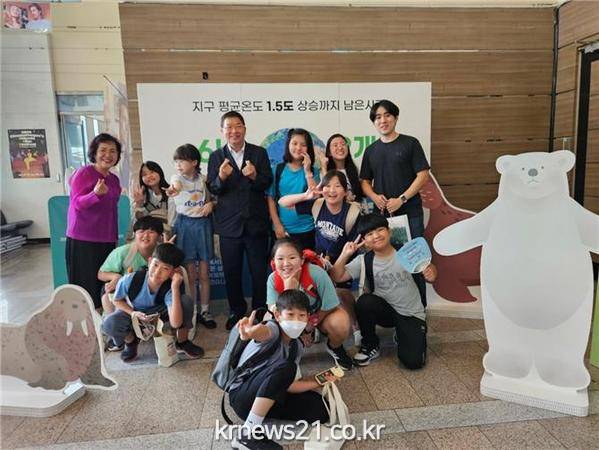 ▲ 사진=영화제에 참여한 초등학생들과 사진을 남긴 김경호 광진구청장광진구(구청장 김경호)가 27일부터 이틀간 ‘제1회 광진 기후1.5도 영화제’를 개최한다.