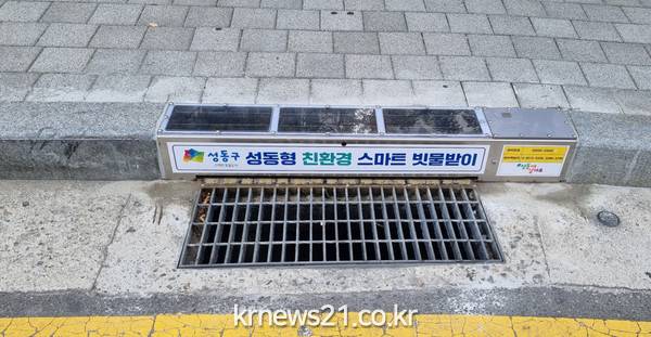 ▲ 사진=우천 시 빗물받이 덮개가 자동으로 열린 모습서울 성동구(구청장 정원오)는 기존 빗물받이 개선, 악취와 침수피해를 막는 ‘성동형 친환경 스마트 빗물받이’를 성수동 카페거리 등 총 83곳에 확대 설치한다.