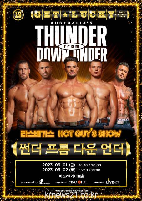 ▲ 사진=라이브엑트미국 라스베이거스에서 여성 관객들이 가장 열광하는 ‘썬더 프롬 다운 언더(Thunder From Down Under)’가 ‘2023 겟 럭키 월드투어(2023 Get Lucky World Tour)’의 한국 공연을 확정했다. ‘썬더 프롬 다운 언더’는 독일, 네덜란드, 캐나다, 남아공 등 전 세계 4개 대륙, 100개 이상의 도시의 관객들을 만나왔으며, 코로나 팬데믹 이후 오랜만에 해외 관객들을 만날 수 있는 기회를 맞아 보다 열정적이고 특별한 공연을 선보일 예정이다.