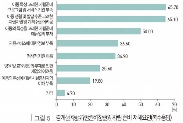 ‘이들의 생활 및 발달 수준 고려한 자립지원 및 계획수립 어려움’(65.10%) 또한 자립준비를 저해하는 주요 요인으로 꼽았다.