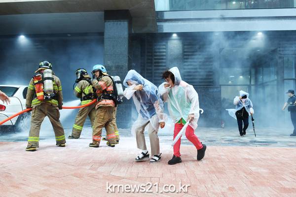 아파트 관리소 직원 등으로 구성된 자위소방대가 차량 초기화재 진압을 위해 투입됐고, 뒤이어 도착한 소방의 선착대가 운전자 구조를 실시했으며, 차량폭발에 따라 건물 상층부로 화재가 확대된 상황을 가정해 ▲굴절차 ▲등하강기 ▲헬기를 통한 ‘인명구조’ ▲고가사다리차 ▲펌프차를 동원한 ‘화재진압’ 훈련이 이뤄졌다.