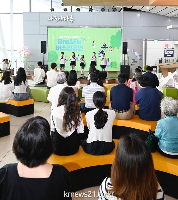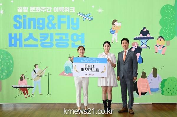 한국공항공사(사장 윤형중)는 30일, 공항 문화주간 이륙위크(26week)를 맞아 김포공항 국내선 터미널에서 공항이용객들과 함께하는 ‘Sing&Fly 버스킹’ 공연 무대를 마련했다.
