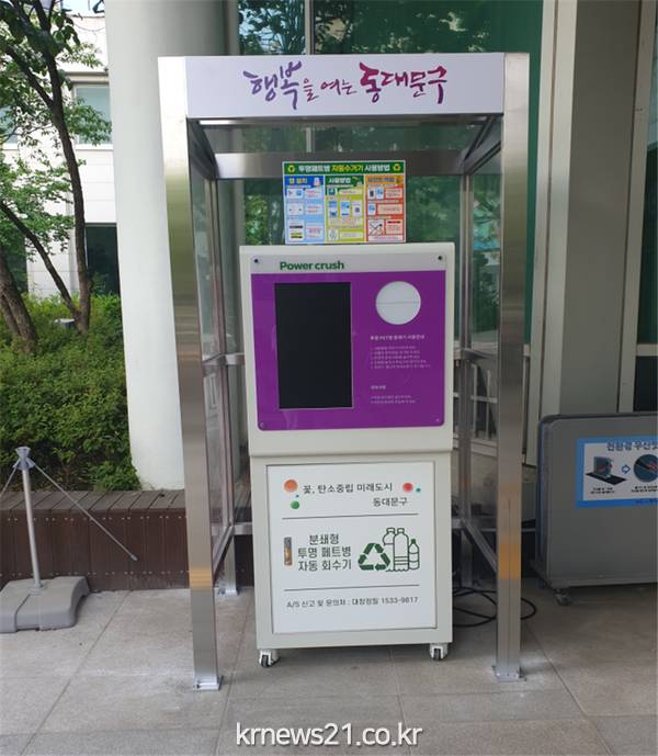 ▲ 사진=구청사 투명페트병 무인회수기동대문구(이필형 구청장)는 고품질의 재활용자원을 원활히 확보할 수 있도록 6월 7일부터 운영 중인 ‘투명페트병 무인회수기’의 올바른 사용법을 주민들에게 홍보 중이다.