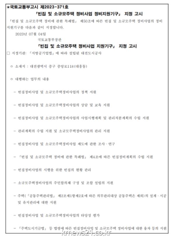 박필우 대전시 도시주택국장은 “이번 정비지원기구 지정으로 빈집 및 소규모주택정비사업이 탄력을 받을 것으로 기대된다. 대전도시공사를 중심으로 빈집 및 소규모주택정비사업을 체계적으로 추진해 나가겠다”고 말했다.