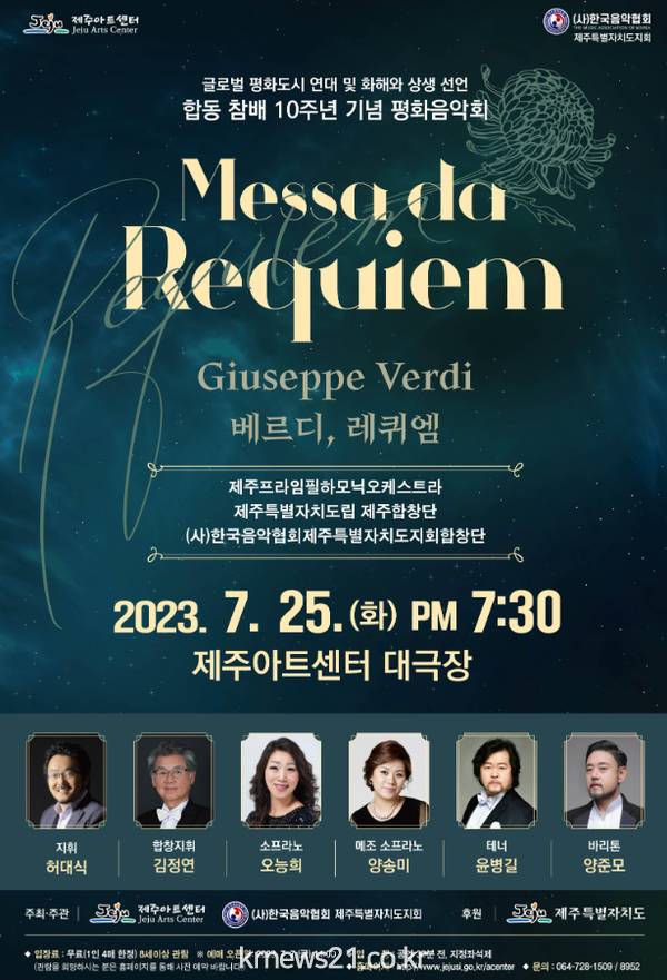 연주에는 특별히 제주특별자치도립 제주합창단과 제주프라임필하모닉오케스트라가 함께 호흡을 맞추며, 소프라노 오능희, 메조 소프라노 양송미, 테너 윤병길, 바리톤 양준모 등이 출연해 영혼을 울리는 감동의 무대를 선사할 예정이다.