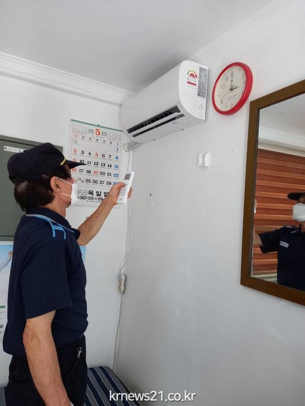 ▲ 사진=성동구의 한 아파트 관리원이 구에서 전기료를 지원하는 에어컨의 전원을 켜고 있다. 서울 성동구(구청장 정원오)는 폭염에 대비해 올해 7월부터 두 달간 공동주택 관리원 및 미화원 근무환경 개선을 위해 에어컨 1대당 월 최대 2만 원을 지원한다고 밝혔다.