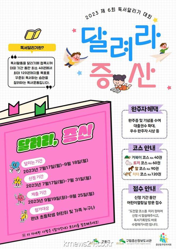▲ 사진=달려라 증산 안내 포스터은평구(구청장 김미경)는 구립증산정보도서관에서 독서 습관을 장려하기 위한 ‘2023년 제6회 독서달리기 대회 <달려라, 증산!>’을 오는 17일부터 9월 18일까지 진행한다고 밝혔다.