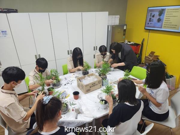 참여 학생들은 원예치료 선생님으로부터 여러 가지 식물(테이블 야자, 후마타, 화이트 스타, 레드 스타)이 가진 특징과 심는 방법, 돌보는 방법 등에 대해 배우고 “정성스럽게 만든 나만의 테라리움을 반려 식물로 여기고, 아끼면서 소중하게 가꿀 것!”이라고 다짐을 밝히기도 하였다.