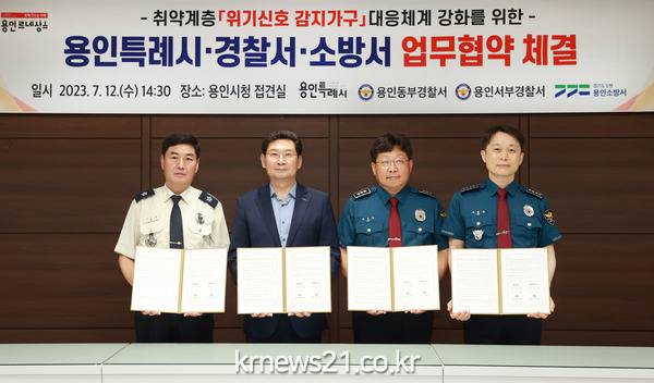 시는 지난 12일 용인동부경찰서, 용인서부경찰서, 용인소방서와 함께 용인특례시청 접견실에서 '취약계층 위기신호 감지가구 공동대응 업무 협약'을 체결했다.