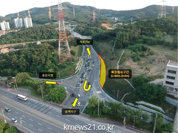 ▲ 사진=용인특례시가 삼가교차로 서용인IC 방면 U턴 차로를 확장할 계획이다신중부대로에서 화성-광주고속도로 서용인IC로 향하는 차량 통행이 수월해질 전망이다.