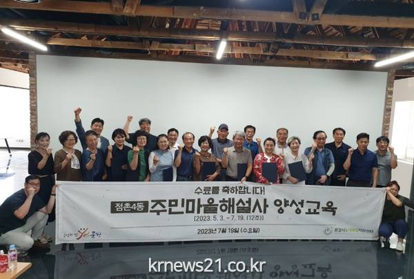 ▲ 사진=문경시문경시 도시재생과와 문경시도시재생지원센터는 지난 7월 19일 박정호 문경시도시재생지원센터장 및 김환국 13통장, 황재석 10통장 등 주민 수료생을 포함하여 28여 명이 참석한 가운데, 경제기반형 도시재생사업의 일환인 주민참여교육 프로그램 「마을해설사 양성교육」수료식을 마쳤다.