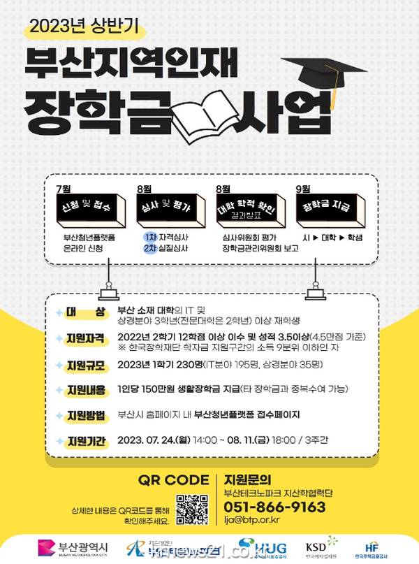 부산시(시장 박형준)는 7월 24일부터 8월 11일까지 3주간 ‘2023년 상반기 부산지역인재 장학금’ 지원 신청을 받는다고 밝혔다.