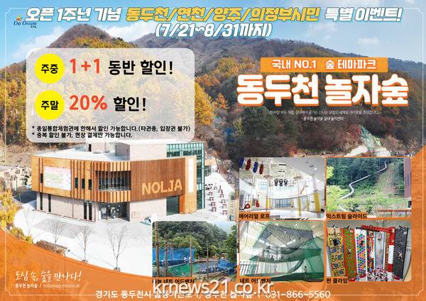 ▲ ‘동두천 놀자숲 오픈 1주년 기념’ 인근 시·군 할인 이벤트 진행동두천 놀자숲(경기 동두천시 탑동가산로1)은 오는 7월 28일 오픈 1주년을 기념해 인근 시·군민 대상으로 특별 할인 이벤트를 진행한다고 밝혔다.