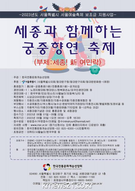 유·무형 전통문화재 지킴이 단체인 한국전통문화계승선양회(약칭: 한문회, 대표: 김선풍)가 ‘2023년 서울특별시 서울민간 예술축제 보조금 지원사업’으로 시행하는 ‘세종과 함께 궁중향연 축제(세종! 新 여민락)’ 기간에 열리는 경연대회의 참가자를 모집한다.