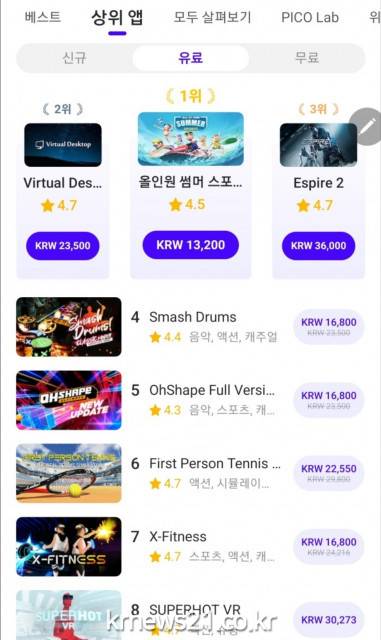 ▲ 사진=앱노리앱노리(대표 이현욱)는 자사의 신작 가상현실(VR) 게임인 ‘올인원 썸머 스포츠 VR’이 피코(PICO) 7월 25일 글로벌 스토어 전체 유료 앱 순위 1위를 차지했다고 밝혔다.