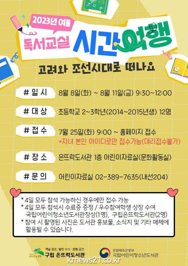 어린이들은 ‘시간여행’을 주제로 역사 분야 책을 읽는 등 독서·독후 활동을 통해 창의력과 상상력을 기를 수 있다. 참여자 중 우수 어린이에게는 국립어린이청소년도서관장상(1명), 구립은뜨락도서관장상(2명)을 수여할 예정이다.