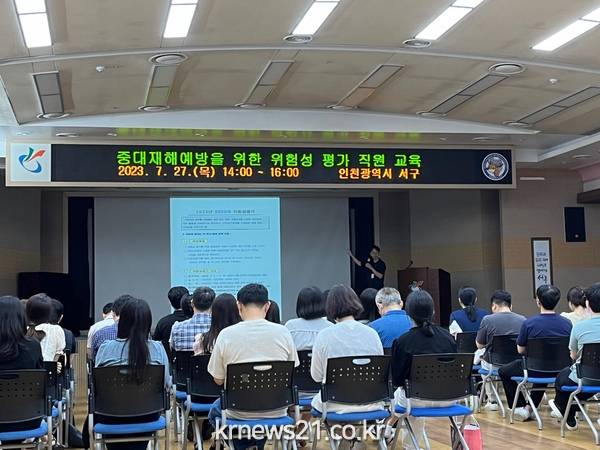 인천 서구(구청장 강범석)가 27일 올해 정기 위험성 평가를 앞두고 담당자 59명이 참석한 가운데 ‘중대재해예방을 위한 위험성 평가 직원 교육’을 진행했다.