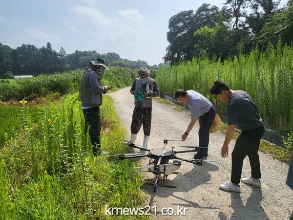 ▲ 여흥동, 농업용 무인공동방제기(드론)로 병해충 원천 차단여주시 여흥동장(박창주)은 지난 7.28(금) 여흥동 일부 지역에 농업용 무인공동방제기(드론)을 이용한 약제살포하는 현장을 방문하여 격려하였다.