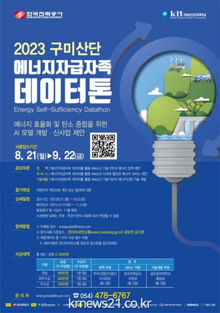 이번 데이터톤 대회는 구미국가산업단지의 에너지자급자족형 인프라 구축사업을 통해 추진되는 것으로 한국전력공사가 주최하며, 국립금오공과대학교가 주관한다. 이어 △산업통상자원부 △경상북도 △구미시 △한국산업단지공단 경북구미스마트그린산단 △미국MMAI △엔에스랩의 후원으로 개최한다.