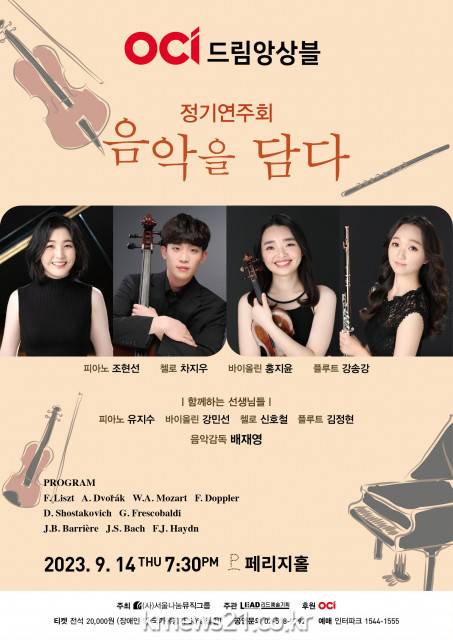서울나눔뮤직그룹(대표 배재영)이 주최하고, 리드예술기획이 주관하는 이번 정기연주회는 4인의 OCI 드림앙상블 단원 조현선(피아노), 차지우(첼로), 홍지윤(바이올린), 강송강(플루트)의 연주로, 1부에는 △하이든 - 피아노 3중주 (Hob.XV:16) △모차르트 - 플루트 소나타(K. 13), 바이올린 소나타(K.305) △리스트 - 초절기교 연습곡 제3번 ‘라 캄파넬라’ △프레스코발디 - 토카타 △바흐 - 트리오 소나타(BWV 1038)가 연주될 예정이다.