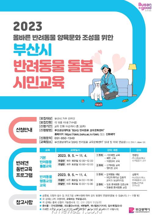 부산시(시장 박형준)는 오는 9월 5일부터 11월 4일까지 부산경상대학교 반려동물교육문화센터에서 ‘2023 부산시 반려동물 돌봄 시민교육’을 운영한다고 밝혔다.