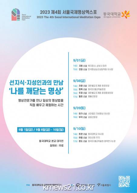 ▲ 사진=마인드디자인‘제4회 서울국제명상엑스포’의 체험프로그램 ‘선지식·지성인과의 만남 - 나를 깨닫는 명상’을 9월 1일부터 22일까지 3주간 총 7일 동안 동국대학교 본교 대각전에서 개최한다.