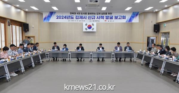 ▲  사진=김제시김제시는 지난 25일, 2024년도 주요업무계획 수립과 본예산 편성을 앞두고 시청 3층 대회의실에서 정성주 시장 주재로‘2024년 신규시책 발굴보고회’를 개최했다.