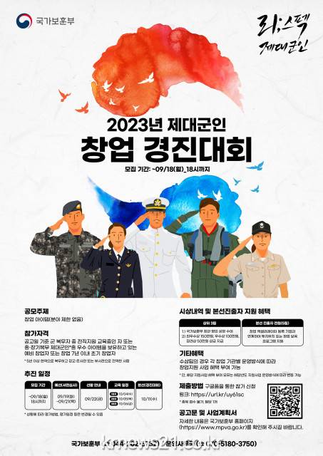 국가보훈부는 제대군인들의 잠재된 창업 의욕을 고취하기 위해 ‘2023년 제대군인 창업 경진대회’를 개최한다고 밝혔다.