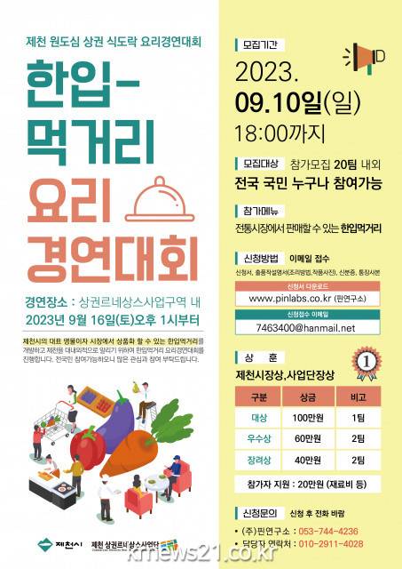 ‘제천 원도심 상권 식도락 요리경연대회’는 올해로 2년차를 맞은 요리대회로, 더욱 경쟁력 있고 다양한 먹거리 상품 발굴을 위해 제천시를 비롯한 전국으로 확대해 참가팀을 모집한다.