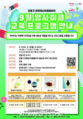 9월에 열릴 업사이클 교육은 ▲종이 소재로 만드는 ‘도어벨 오너먼트’ 만들기 ▲자투리 종이로 만드는 ‘메모꽂이’ 만들기 ▲폐지로 만드는 ‘나만의 새활용 노트’ 만들기 ▲폐플라스틱 병뚜껑으로 만드는 ‘멜팅폴리 키링’ 만들기 프로그램 등이며 9월 13일과 18일, 20일에 걸쳐 3일간 원데이 클래스 형식으로 진행한다.