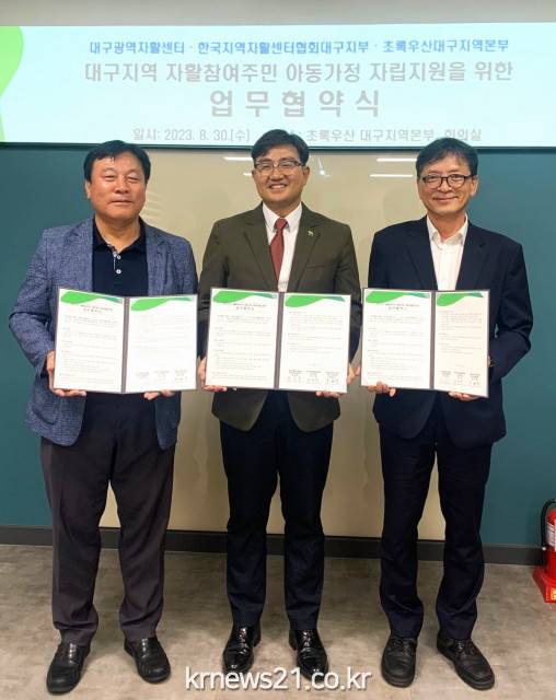 한국자활복지개발원 대구광역자활센터(센터장 박송묵)는 8월 30일(수) 한국지역자활센터협회 대구지부(지부장 손수진), 초록우산 어린이재단 대구지역본부(본부장 문희영)와 함께 저소득아동가정의 안정적인 자립지원을 위한 업무협약을 체결했다고 밝혔다.