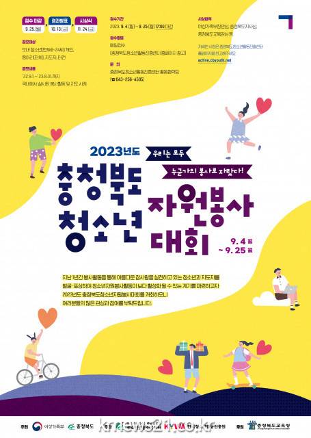 ▲ 사진=충청북도청소년활동진흥센터충청북도는 4일부터 여성가족부와 공동 주최하고, 충청북도청소년활동진흥센터와 한국청소년활동진흥원이 공동 주관하며, 충청북도교육청이 후원하는 ‘2023년도 충청북도청소년자원봉사대회’의 봉사활동 우수사례 접수를 시작한다고 밝혔다.