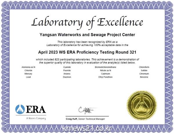 ▲ 사진=양산시양산시 상하수도사업소 먹는물 수질검사기관은 올해 미국 환경자원협회(ERA) 국제숙련도 평가(PT : Proficiency Testing)에서 최고 수준의 먹는물 분야 분석능력을 인정받았다고 9월 4일 밝혔다.