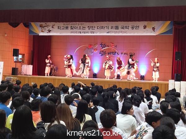 ▲ 사진=김포교육지원청경기도김포교육지원청 김포호수초등학교(교장 김상호)는 6일 5학년~6학년 학생들이 학교로 찾아오는 신나는 예술여행의 타피플 팀의 “장단 더하기 리듬” 국악 공연을 관람했다고 전했다.