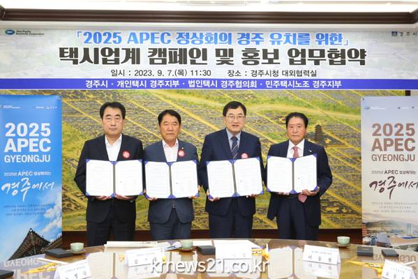 경주시는 7일 시청 대외협력실에서 주낙영 경주시장, 김재봉 개인택시 경주지부장, 이동철 법인택시 경주협의회장, 노병국 민주택시노조 경주지부장 등 지역 택시업계 대표자와 ‘2025 APEC 정상회의 경주 유치를 위한 선진시민의식 캠페인 및 홍보 업무협약(MOU)’을 체결했다고 밝혔다.