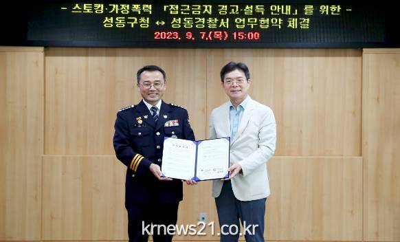 ▲ 사진=성동구서울 성동구(구청장 정원오)는 지난 7일 성동경찰서와 협약을 맺고 스토킹, 가정폭력 등 범죄 피해자를 보호하기 위해 ‘가해자 접근금지 경고‧설득 안내’ 사업을 추진한다.