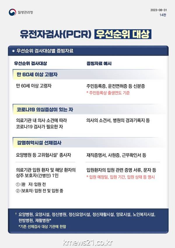 선별진료소 코로나 19 PCR검사 우선순위 대상자는 ▲만 60세 이상 고령자(신분증 지참) ▲코로나19 의심증상이 있는 자(의사의 소견서 지참) ▲요양병원 등 고위험시설 종사자(재직증명서, 사원증 등 지참) ▲의료기관 입원 환자 및 해당환자의 상주보호자(간병인) 1인(입원 환자의 입원 관련 증명 서류, 문자 지참)