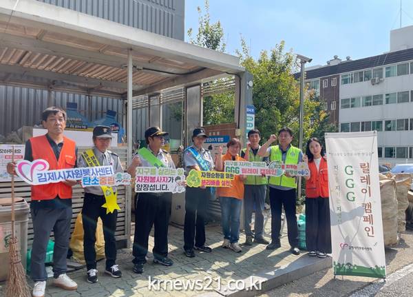 ▲ 사진=김제시김제시 자원봉사센터(센터장 남궁행원)는 지난 11일 검산주공 1차 아파트에서 김제검산관리소(소장 이근호) 및 검산주공 주거복지센터(센터장 양미재)와 연계하여 아파트 통장단, 검산자율방범대 회원 10여 명과 함께 GGG(지구를 지키는 지평선) 릴레이 캠페인 활동을 실시하였다.