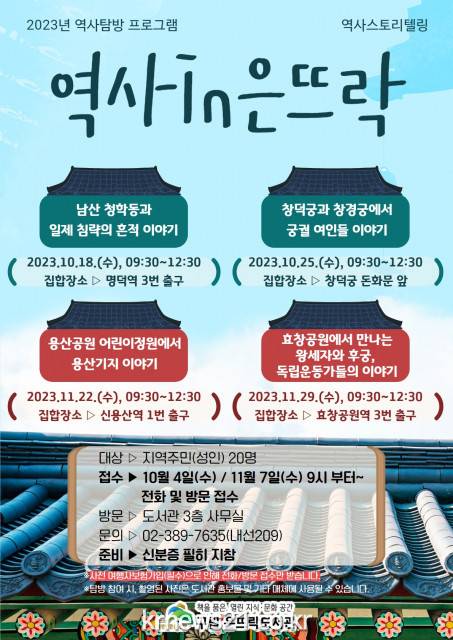 ▲  사진=구립 은뜨락도서관‘책을 품은, 열린 지식·문화공간’ 구립 은뜨락도서관(관장 김명수)은 역사스토리텔링 ‘역사in은뜨락’ 역사탐방 프로그램을 내달 18일(수)부터 11월 29일(수)까지 총 4회에 걸쳐 운영한다고 밝혔다.