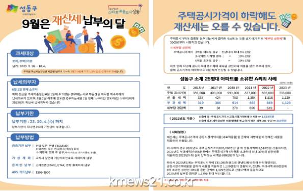 ▲ 사진=성동구서울 성동구(구청장 정원오)가 관내 소재 주택과 토지의 소유자에게 2023년 9월 정기분 재산세 120,405건 1,278억 원(병기세목 포함)을 부과한다고 밝혔다.
